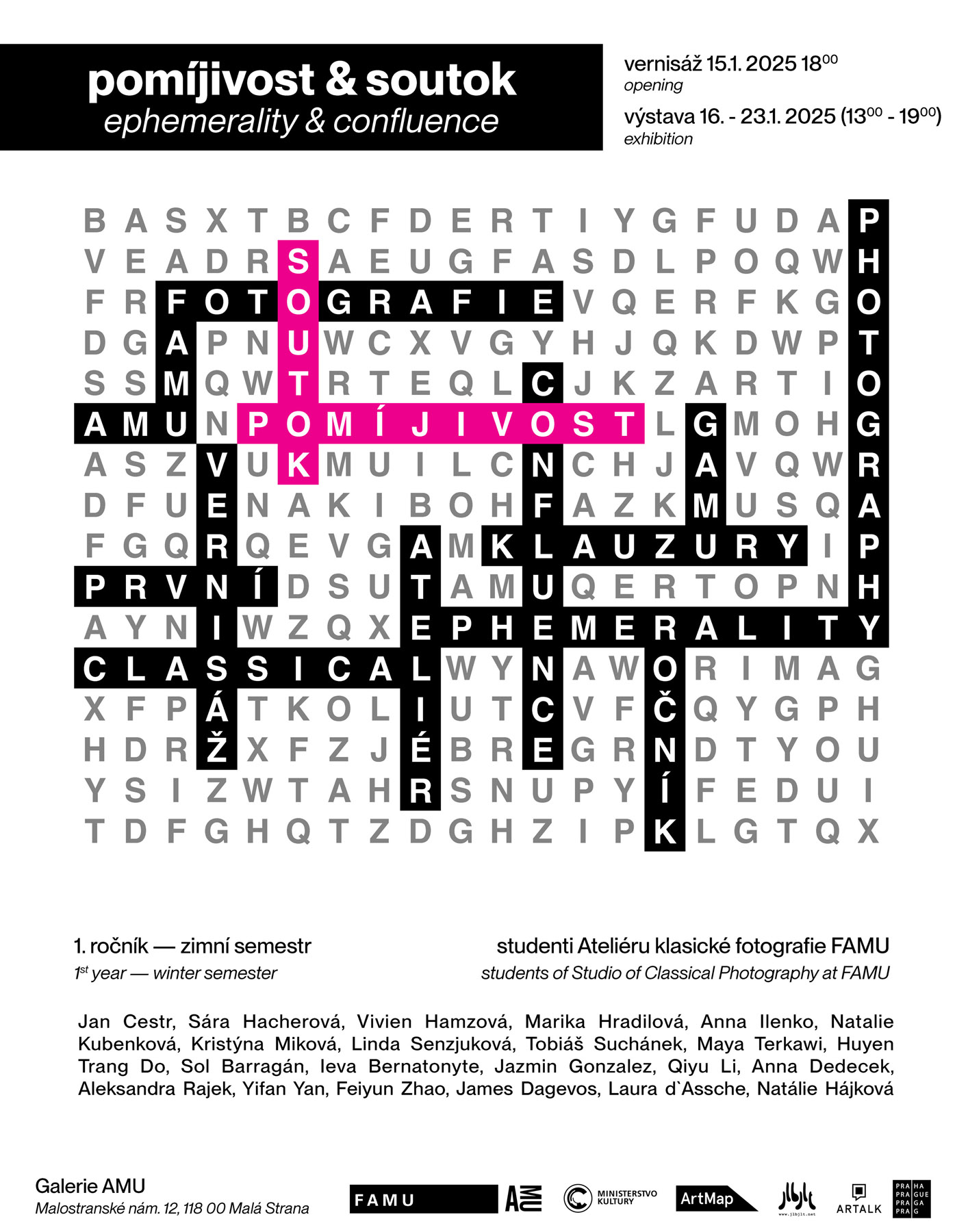 Klauzury Ateliéru klasické fotografie 1. ročníku FAMU. Výstavní soubor „Pomíjivost ve fotografii“ a výstupy z dlouhodobého projektu zkoumajícího městskou krajinu „Soutok“.