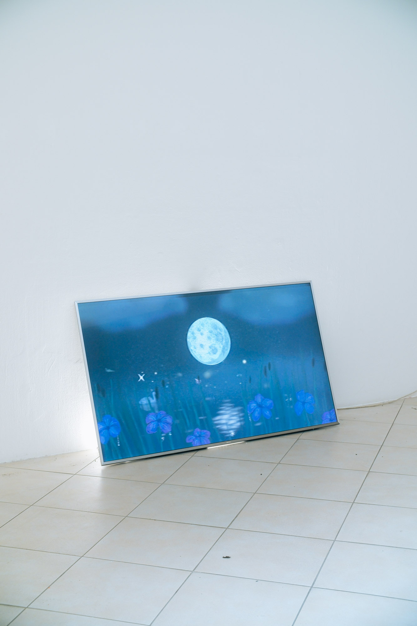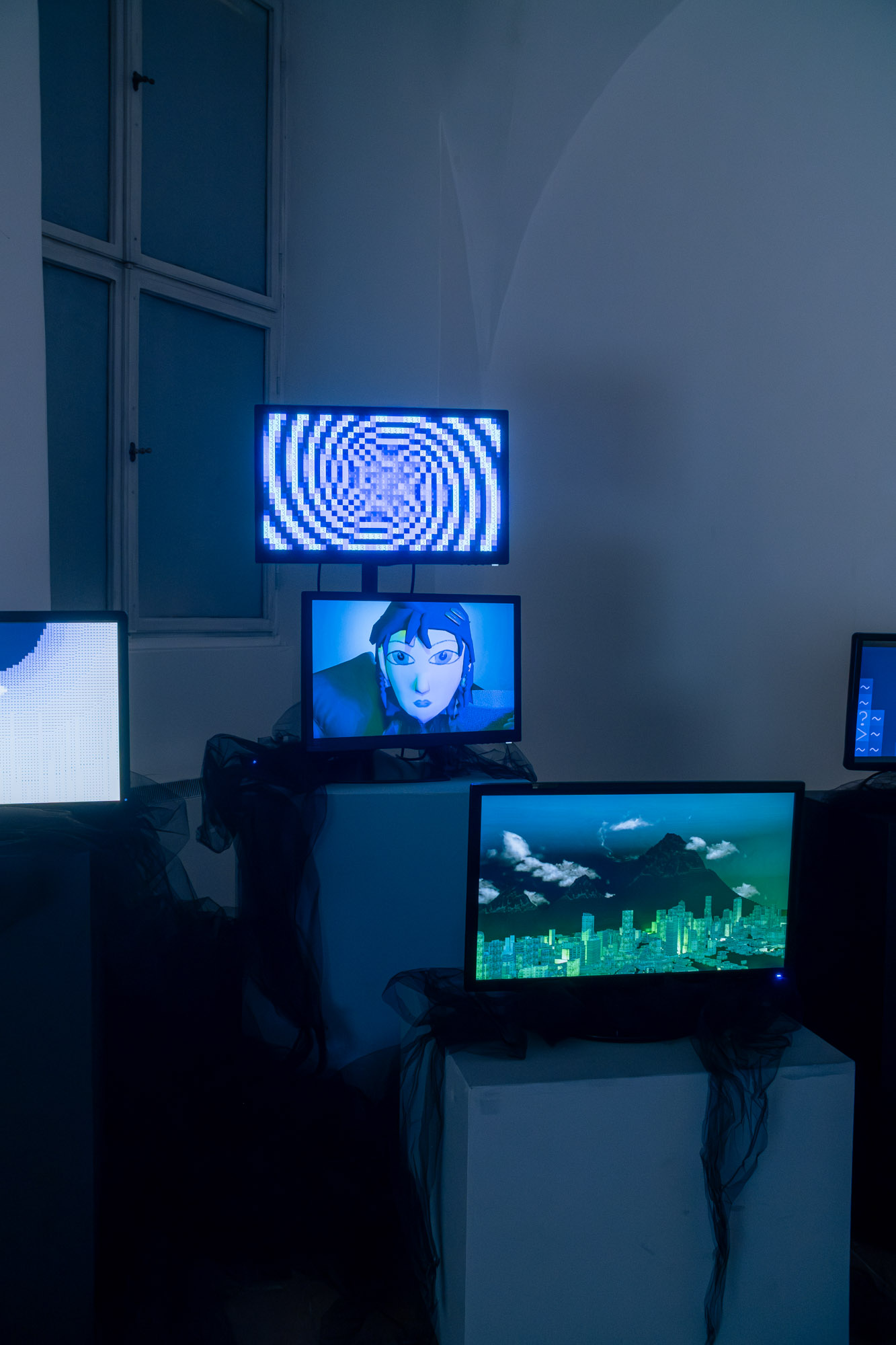 The Tralalily video was produced for this exhibition and acts as a mood setter, initiating the audience into their expectations. It follows the life of a virtual lily imprisoned in an indeterminate environment – a club aesthetic. Uncontrollably transforming every few seconds, the flower sings, expressing her alienation and frustration from the situation.